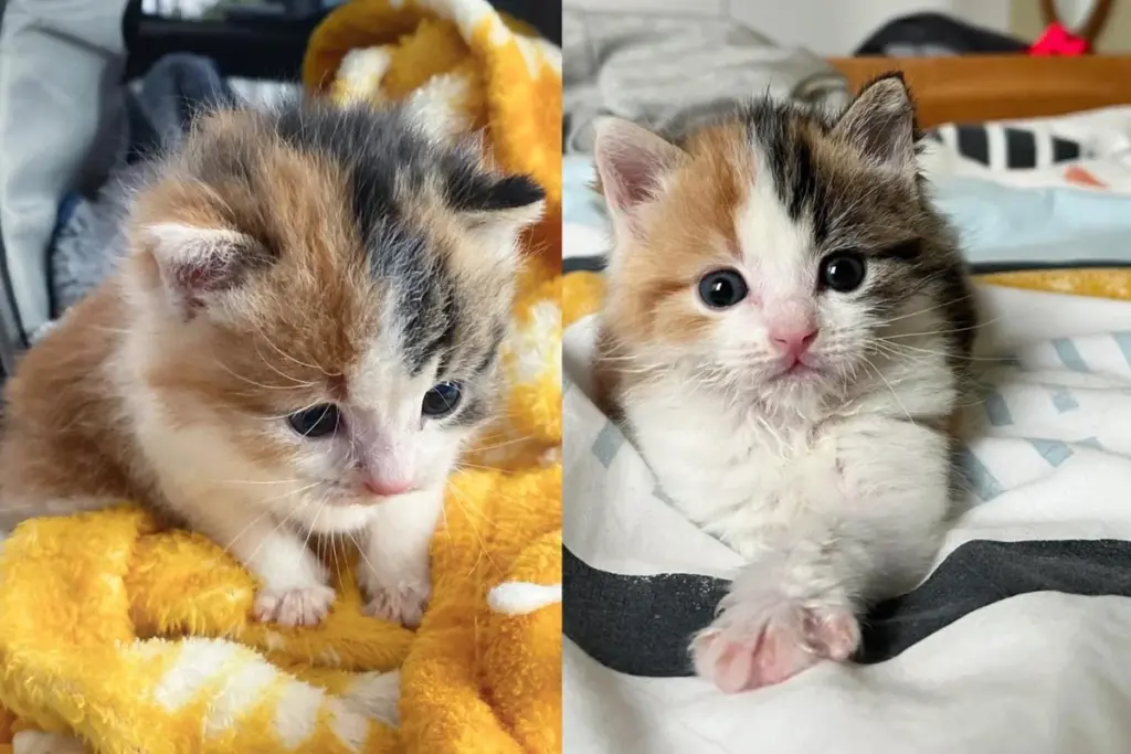 At just three weeks old, the kitten—later named Kicklie—arrived weak and cold. The rescuers quickly warmed her up before feeding her. Despite dealing with some tummy issues, she showed a strong spirit. After being fed, she cozied up in soft blankets and gently held her foster mom’s hand as she fell asleep.