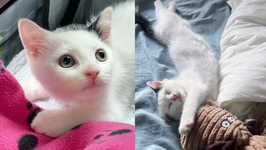 A kind-hearted man spotted a tiny kitten wandering alone in the back of a parking lot. As he approached, he noticed she was barely moving and in need of urgent help. He looked around for any sign of her mother or siblings, but she was completely alone, frail, and in poor shape. The man gently placed her in a cardboard box and made it his mission to get her the care she needed.